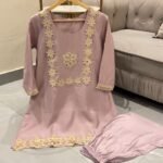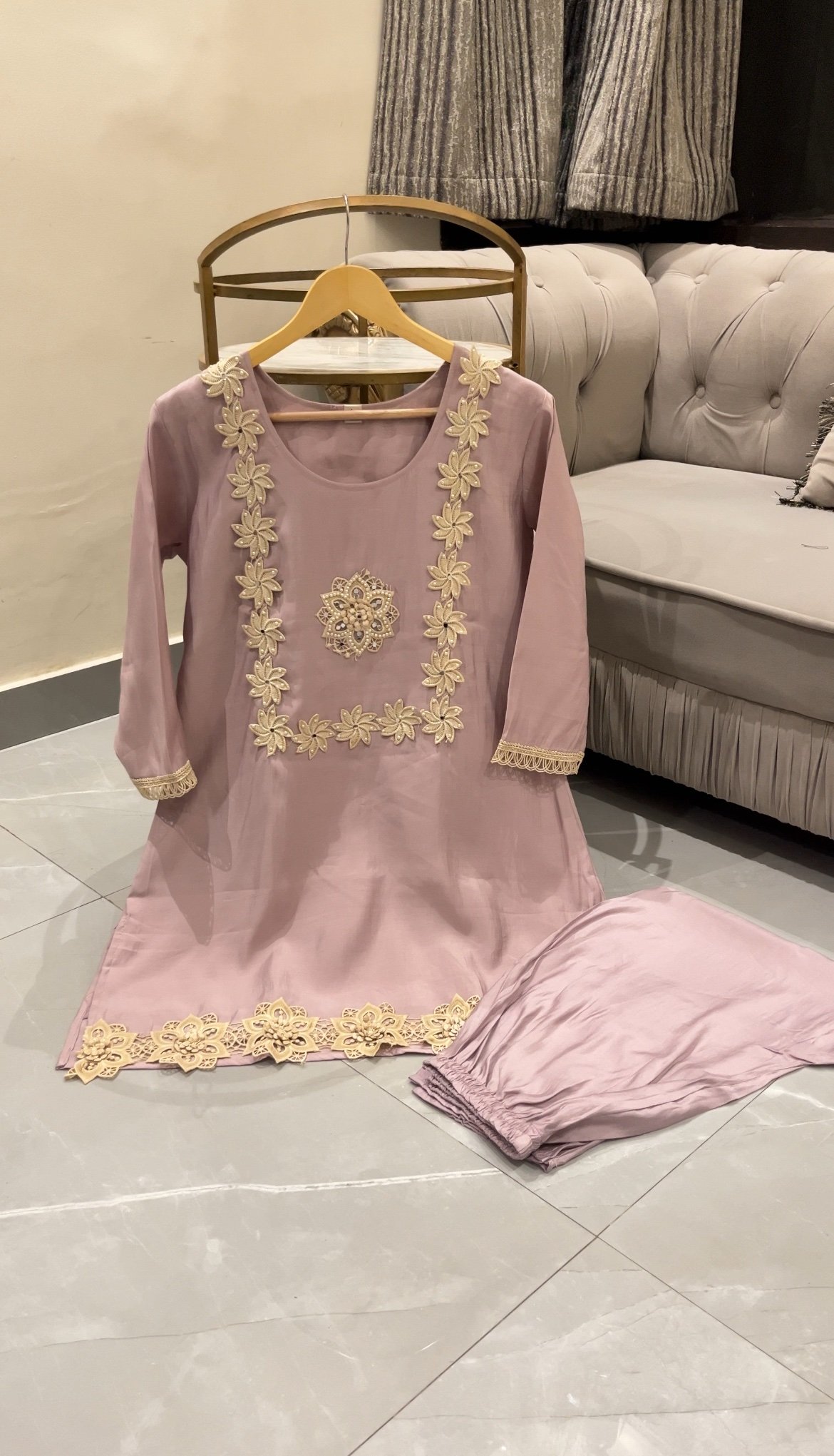 The dusty mauve cord set showcases graceful floral lace embroidery adorning the yoke and borders, with a subtle pastel tone ideal for everyday elegance. Its lightweight texture and intricate detailing reflect timeless charm, making it a versatile addition to any wardrobe.