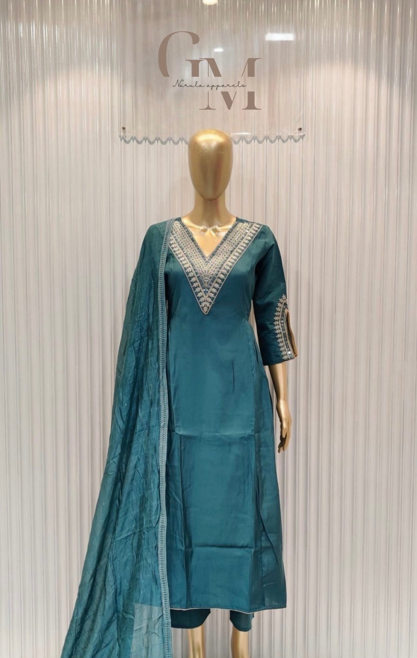 Elevate your ethnic wardrobe with this elegant teal silk suit set, designed with timeless charm and contemporary finesse. The straight kurta features a deep V-neckline beautifully adorned with intricate thread and mirror embroidery, adding a touch of grace and sophistication. The 3/4th sleeves come with matching embroidery for a refined finish.